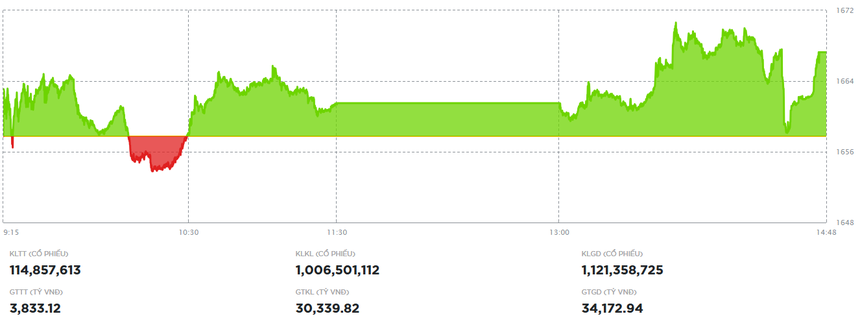 Đóng cửa, sàn HOSE có 252 mã tăng và 84 mã giảm, VN-Index tăng 9,51 điểm (+0,57%), lên 1.667,26 điểm. Tổng khối lượng giao dịch đạt hơn 1,11 tỷ đơn vị, giá trị 33.710,1 tỷ đồng, giảm hơn 12% về khối lượng và 8% về giá trị so với phiên hôm qua. Giao dịch thỏa thuận đóng góp hơn 115 triệu đơn vị, giá trị 3.850,8 tỷ đồng.
