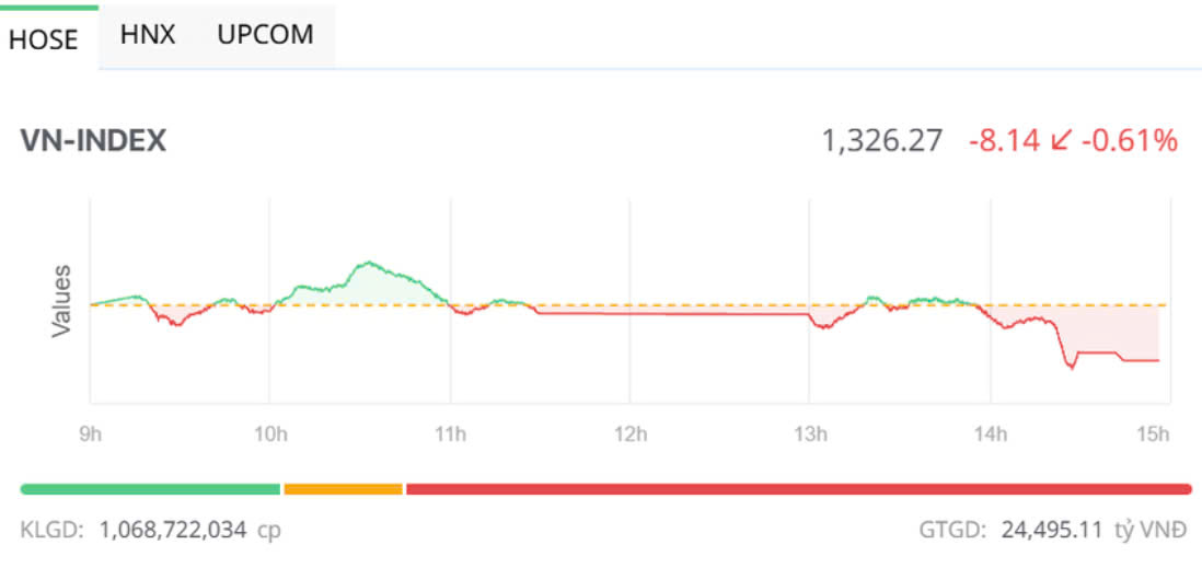 Đóng cửa, sàn HOSE có 121 mã tăng và 366 mã giảm, VN-Index giảm 8,41 điểm (-0,61%), xuống 1.326,27 điểm. Tổng khối lượng giao dịch đạt hơn 1,068 tỷ đơn vị, giá trị 24.495,1 tỷ đồng, tăng hơn 13% về khối lượng và gần 12% về giá trị so với phiên hôm qua. Giao dịch thỏa thuận có thêm hơn 71,1 triệu đơn vị, giá trị 1.378 tỷ đồng.