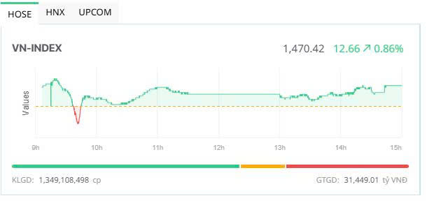 Chốt phiên, sàn HOSE có 206 mã tăng và 117 mã giảm, VN-Index tăng 12,66 điểm (+0,87%), lên 1.470,42 điểm. Tổng khối lượng giao dịch đạt xấp xỉ 1,35 tỷ đơn vị, giá trị 31.449 tỷ đồng, tăng 6,3% về khối lượng và giảm nhẹ 1,5% về giá trị so với phiên cuối tuần qua ngày 11/7.