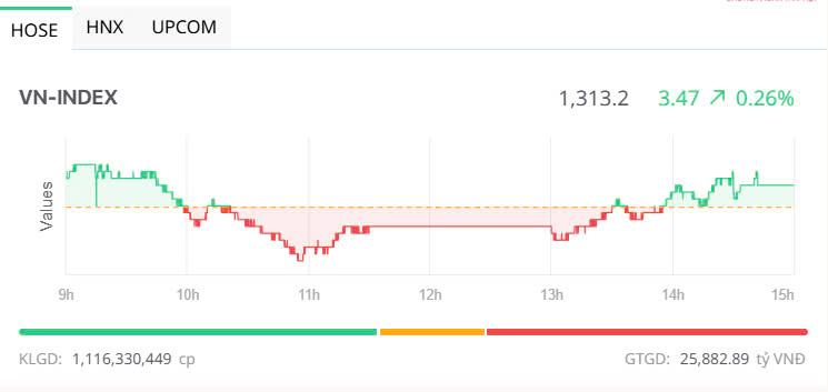 Chốt phiên, sàn HOSE có 172 mã tăng và 154 mã giảm, VN-Index tăng 3,47 điểm (+0,26%), lên 1.313,2 điểm. Tổng khối lượng giao dịch đạt hơn 1.116,3 triệu đơn vị, giá trị 25.882,9 tỷ đồng, tăng nhẹ 4% về khối lượng và giảm nhẹ 5% về giá trị so với phiên hôm qua. Giao dịch thỏa thuận đóng góp hơn 100 triệu đơn vị, giá trị gần 3.268 tỷ đồng.