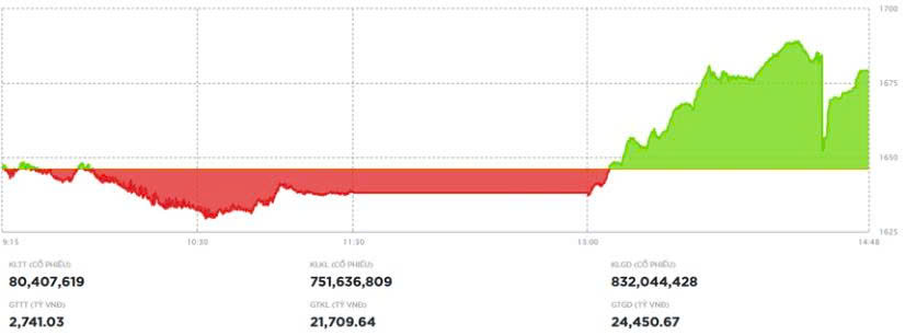 Tại ngưỡng điểm này, một bộ phận nhà đầu tư tranh thủ cơ cấu danh mục và đà tăng thu hẹp về gần 1.655 điểm trước khi thêm một lần nữa dòng tiền chảy mạnh vào nhóm bluechip giúp VN-Index bật lên gần 1.680 điểm khi đóng cửa.
