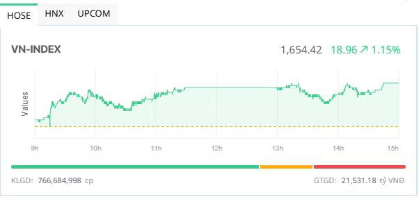 Đóng cửa, sàn HOSE có 227 mã tăng và 86 mã giảm, VN-Index tăng 18,96 điểm (+1,16%), lên 1.654,42 điểm. Tổng khối lượng giao dịch đạt gần 766,7 triệu đơn vị, giá trị 21.531 tỷ đồng, tăng 8,9% về khối lượng và gần 3,5% về giá trị so với phiên cuối tuần trước ngày 14/11. Giao dịch thỏa thuận đóng góp hơn 105,4 triệu đơn vị, giá trị 2.820,7 tỷ đồng.