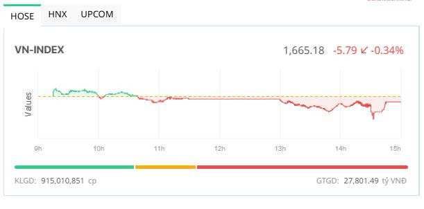 Đóng cửa, sàn HOSE có 108 mã tăng và 208 mã giảm, VN-Index giảm 5,79 điểm (-0,35%), xuống 1.665,18 điểm. Tổng khối lượng giao dịch đạt hơn 915 triệu đơn vị, giá trị 27.801,5 tỷ đồng, cùng giảm hơn 14% cả về khối lượng và giá trị so với phiên hôm qua. Giao dịch thỏa thuận đóng góp 51,4 triệu đơn vị, giá trị 2.366 tỷ đồng.