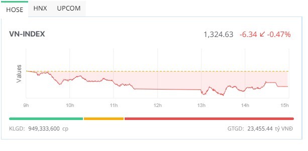 Chốt phiên, VN-Index giảm 6,34 điểm (-0,48%), xuống 1.324,63 điểm với 139 mã tăng (nhiều hơn 52 mã so với phiên sáng) và 320 mã giảm (ít hơn 35 mã so với phiên sáng). Tổng khối lượng giao dịch đạt 949,3 triệu đơn vị, giá trị 23.455,4 tỷ đồng, tăng 5% về khối lượng và tăng hơn 19% về giá trị so với phiên hôm qua. Trong đó, giao dịch thỏa thuận đóng góp 113,7 triệu đơn vị, giá trị 3.216,2 tỷ đồng.