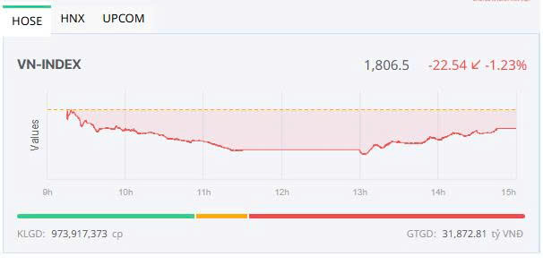 Chốt phiên, sàn HOSE có 128 mã tăng và 210 mã giảm, VN-Index giảm 22,54 điểm (-1,23%) xuống 1.806,5 điểm. Tổng khối lượng giao dịch đạt hơn 973,9 triệu đơn vị, giá trị 31.872 tỷ đồng, tăng 11,2% về khối lượng và 12,66% về giá trị so với phiên cuối tuần trước. Giao dịch thỏa thuận đóng góp hơn 85,5 triệu đơn vị, giá trị 2.312,4 tỷ đồng.