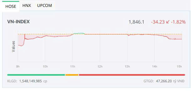 Chốt phiên, sàn HOSE có 106 mã tăng và 244 mã giảm, VN-Index giảm 34,23 điểm (-1,82%) xuống 1.846,1 điểm. Tổng khối lượng giao dịch đạt gần 1,55 tỷ đơn vị, giá trị 47.266 tỷ đồng, tăng 66,7% về khối lượng và 57,3% về giá trị so với phiên cuối tuần qua ngày 27/2. Giao dịch thỏa thuận đóng góp hơn 131,3 triệu đơn vị, giá trị 3.733,3 tỷ đồng.