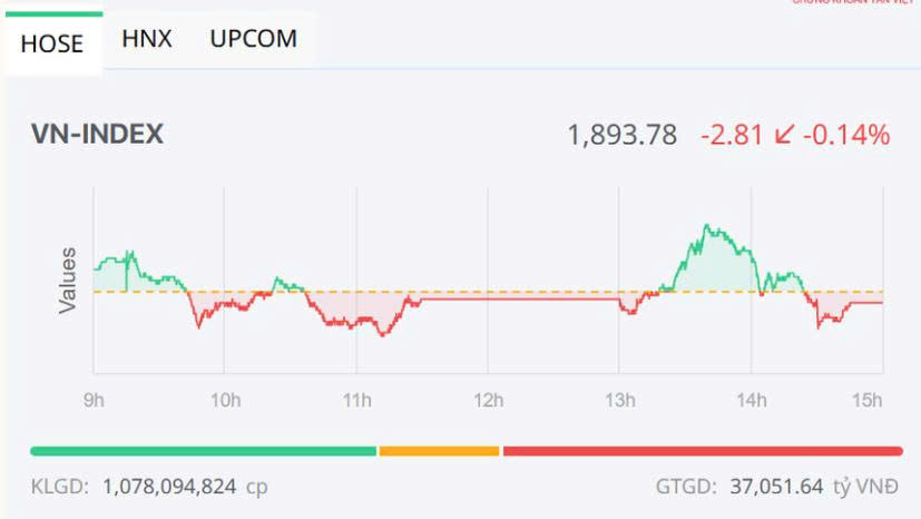 Đóng cửa, sàn HOSE có 149 mã tăng và 180 mã giảm, VN-Index giảm 2,81 điểm (-0,15%), xuống 1.893,78 điểm. Tổng khối lượng giao dịch đạt hơn 1,07 tỷ đơn vị, giá trị 37.051,6 tỷ đồng, giảm 7% về khối lượng và chỉ 1% về giá trị so với phiên hôm qua. Giao dịch thỏa thuận đóng góp hơn 90,5 triệu đơn vị, giá trị 4.080 tỷ đồng.