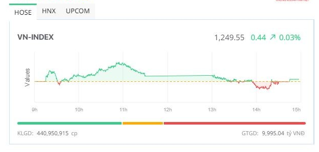 Đóng cửa, sàn HOSE có 176 mã tăng và 240 mã giảm, VN-Index tăng 0,44 điểm (+0,04%), lên 1.249,55 điểm. Tổng khối lượng giao dịch đạt gần 441 triệu đơn vị, giá trị 9.995 tỷ đồng, tăng nhẹ 1,85% về khối lượng nhưng giảm 2,76% về giá trị so với phiên cuối tuần trước ngày 17/1. Giao dịch thỏa thuận đóng góp 84,3 triệu đơn vị, giá trị 2.208,5 tỷ đồng.