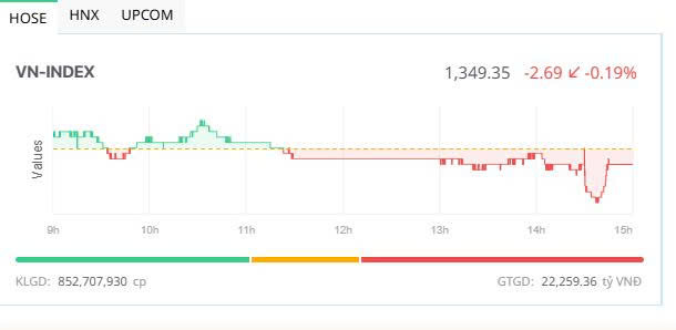 Chốt phiên, sàn HOSE có 135 mã tăng và 167 mã giảm, VN-Index giảm 2,69 điểm (-0,2%) xuống 1.349,35 điểm. Tổng khối lượng giao dịch đạt gần 847,6 triệu đơn vị, giá trị hơn 22.097 tỷ đồng, tăng 6,9% về khối lượng và gần 18% về giá trị so với phiên hôm qua.