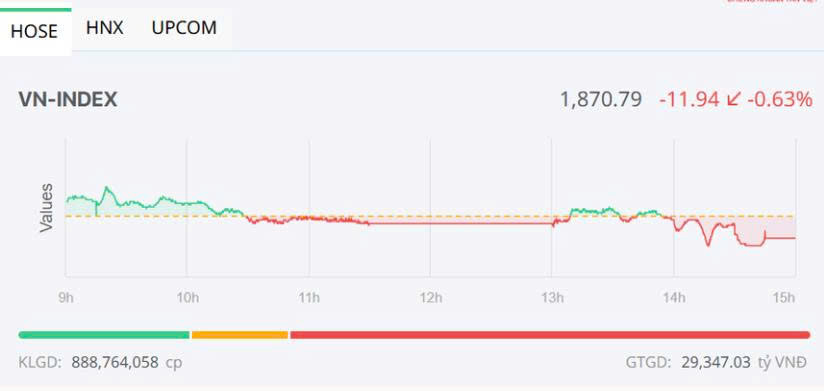 Đóng cửa, sàn HOSE có 81 mã tăng và 251 mã giảm, VN-Index giảm 11,94 điểm (-0,63%), xuống 1.870,79 điểm. Tổng khối lượng giao dịch đạt hơn 888,7 triệu đơn vị, giá trị 29.347 tỷ đồng, giảm hơn 16% về khối lượng và 13% về giá trị so với phiên hôm qua. Giao dịch thỏa thuận đóng góp hơn 47,7 triệu đơn vị, giá trị 1.898 tỷ đồng.