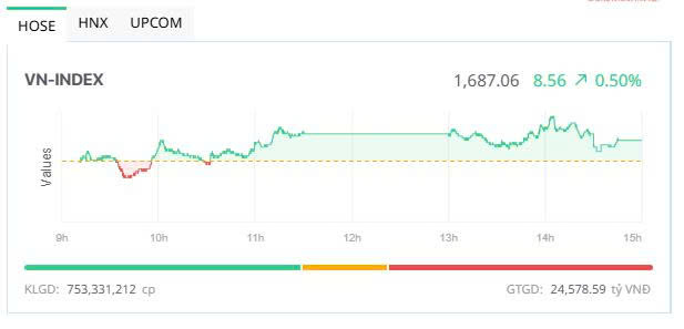 Đóng cửa, sàn HOSE có 157 mã tăng và 156 mã giảm, VN-Index tăng 8,56 điểm (+0,51%), lên 1.687,06 điểm. Tổng khối lượng giao dịch đạt hơn 749 triệu đơn vị, giá trị 24.382 tỷ đồng, giảm hơn 24% cả về khối lượng và giá trị so với phiên hôm qua. Giao dịch thỏa thuận đóng góp 54,4 triệu đơn vị, giá trị 1.813,3 tỷ đồng.