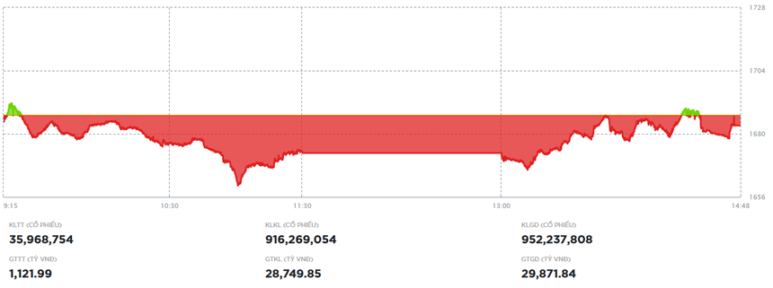 Chốt phiên, sàn HOSE có 117 mã tăng và 190 mã giảm, VN-Index giảm 3,88 điểm (-0,23%), xuống 1.683,18 điểm. Tổng khối lượng giao dịch đạt hơn 940,4 triệu đơn vị, giá trị 29.484,2 tỷ đồng, tăng hơn 25% về khối lượng và 21% về giá trị so với phiên hôm qua. Giao dịch thỏa thuận đóng góp