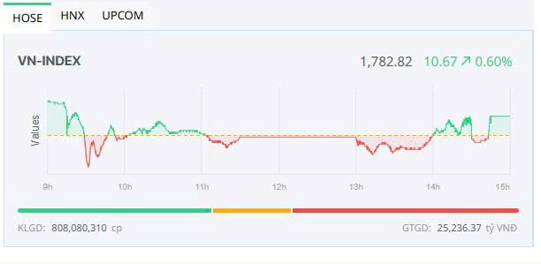 Đóng cửa, sàn HOSE có 144 mã tăng và 169 mã giảm, VN-Index tăng 10,67 điểm (+0,6%), lên 1.782,82 điểm. Tổng khối lượng giao dịch đạt hơn 808 triệu đơn vị, giá trị 25.236 tỷ đồng, giảm 6% về khối lượng và 3,7% về giá trị so với phiên hôm qua. Giao dịch thỏa thuận đóng góp hơn 123,7 triệu đơn vị, giá trị 4.316,2 tỷ đồng.