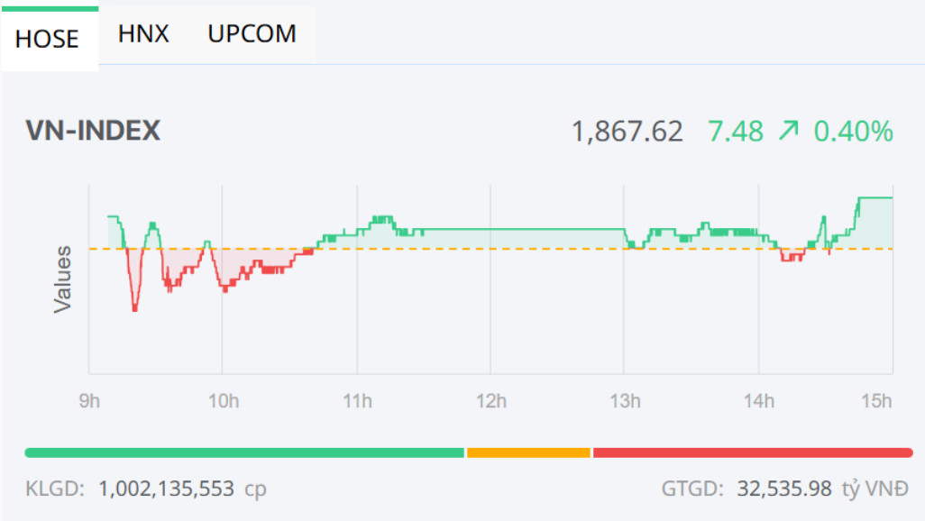 Đóng cửa, sàn HOSE có 187 mã tăng và 142 mã giảm, VN-Index tăng 7,48 điểm (+0,40%), lên 1.867,62 điểm. Tổng khối lượng giao dịch đạt hơn 1 tỷ đơn vị, giá trị 32.536 tỷ đồng, tăng hơn 32% về khối lượng và 38% về giá trị so với phiên hôm qua. Giao dịch thỏa thuận đóng góp hơn 38 triệu đơn vị, giá trị 1.353 tỷ đồng.
