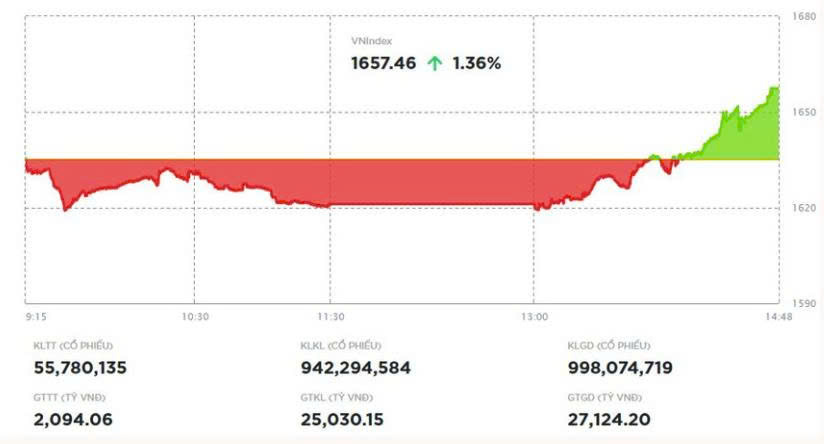 Chốt phiên, VN-Index tăng 22,2 điểm (+1,36%) lên 1.657,46 điểm với 231 mã tăng, trong khi chỉ có 88 mã giảm. Tổng khối lượng giao dịch đạt 998 triệu đơn vị, giá trị 27.124 tỷ đồng, tăng 25% về khối lượng và 16,8% về giá trị so với phiên hôm qua. Trong đó, giao dịch thỏa thuận đóng góp 87,6 triệu đơn vị, giá trị 2.969,7 tỷ đồng.