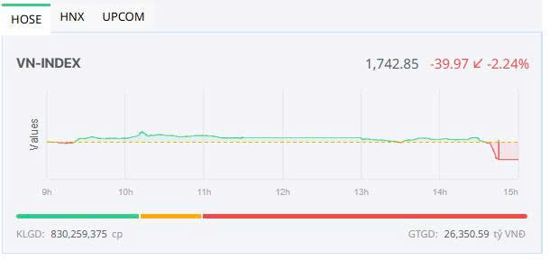 Đóng cửa, sàn HOSE chỉ có 87 mã tăng (5 mã tăng trần) và 238 mã giảm (6 mã giảm sàn), VN-Index giảm 39,97 điểm (-2,24%) xuống 1.742,85 điểm. Tổng khối lượng giao dịch đạt 830,3 triệu đơn vị, giá trị 26.350 tỷ đồng, tăng nhẹ 2,75% về khối lượng và 4,4% về giá trị so với phiên hôm qua. Giao dịch thỏa thuận đóng góp 199,2 triệu đơn vị, giá trị 6.173,3 tỷ đồng.