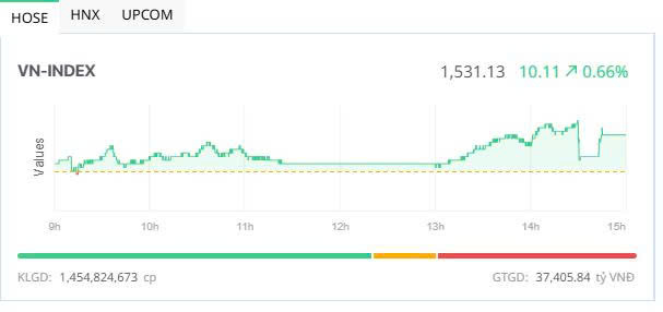 Chốt phiên, sàn HOSE có 207 mã tăng và 126 mã giảm, VN-Index tăng 10,11 điểm (+0,66%), lên 1.531,13 điểm. Tổng khối lượng giao dịch đạt hơn 1, 45 tỷ đơn vị, giá trị 37.406 tỷ đồng, giảm nhẹ về khối lượng và tăng nhẹ về giá trị so với phiên hôm qua. Giao dịch thỏa thuận đóng góp 84,7 triệu đơn vị, giá trị 2.577 tỷ đồng.
