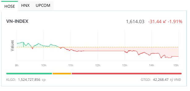 Chốt phiên, sàn HOSE có 100 mã tăng và 233 mã giảm (16 mã giảm sàn), VN-Index giảm 31,44 điểm (-1,91%), xuống 1.614,03 điểm. Tổng khối lượng giao dịch đạt hơn 1,52 tỷ đơn vị, giá trị 42.268,5 tỷ đồng, giảm 33,6% về khối lượng và 32,15% về giá trị so với phiên cuối tuần qua. Giao dịch thỏa thuận đóng góp hơn 58,9 triệu đơn vị, giá trị xấp xỉ 1.603 tỷ đồng.