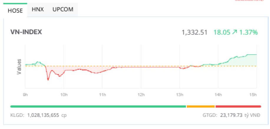 Chốt phiên, sàn HOSE có 253 mã tăng và 72 mã giảm, VN-Index tăng 18,05 điểm (+1,37%) lên 1.332,51 điểm. Tổng khối lượng giao dịch đạt gần 1,03 tỷ đơn vị, giá trị gần 23.180 tỷ đồng, tăng 43,2% về khối lượng và 37,2% về giá trị so với phiên cuối tuần trước ngày 23/5. Giao dịch thỏa thuận đóng góp hơn 66,7 triệu đơn vị, giá trị 1.795,3 tỷ đồng.