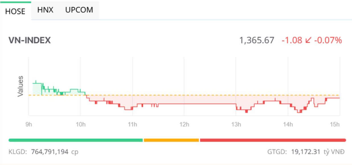 Chốt phiên, sàn HOSE có 141 mã tăng và 155 mã giảm, VN-Index giảm 1,08 điểm (-0,08%), xuống 1.365,67 điểm. Tổng khối lượng giao dịch đạt gần 764,8 triệu đơn vị, giá trị 19.172,3 tỷ đồng, giảm gần 10% về khối lượng và 11% về giá trị so với phiên hôm qua. Giao dịch thỏa thuận đóng góp hơn 79 triệu đơn vị, giá trị 2.639,6 tỷ đồng.