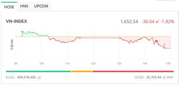 Chốt phiên, sàn HOSE có 143 mã tăng và 178 mã giảm, VN-Index giảm 30,64 điểm (-1,82%), xuống 1.652,54 điểm. Tổng khối lượng giao dịch đạt gần 969,6 triệu đơn vị, giá trị 30.705 tỷ đồng, tăng nhẹ 3,1% về khối lượng và 4,14% về giá trị so với phiên cuối tuần trước ngày 24/10. Giao dịch thỏa thuận đóng góp 66,6 triệu đơn vị, giá trị hơn 2.860 tỷ đồng.
