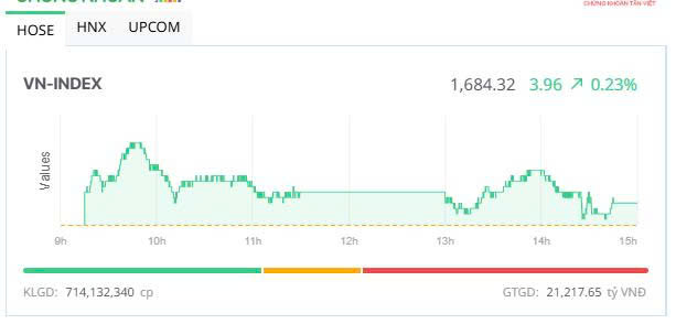 Chốt phiên, VN-Index tăng 3,96 điểm (+0,24%) lên 1.684,32 điểm với 137 mã tăng và 171 mã giảm. Tổng khối lượng giao dịch đạt 714,1 triệu đơn vị, giá trị 21.217 tỷ đồng, giảm 10,1% về khối lượng và 14,6% về giá trị so với phiên hôm qua. Trong đó, giao dịch thỏa thuận đóng góp 115,7 triệu đơn vị, giá trị 3.651 tỷ đồng.