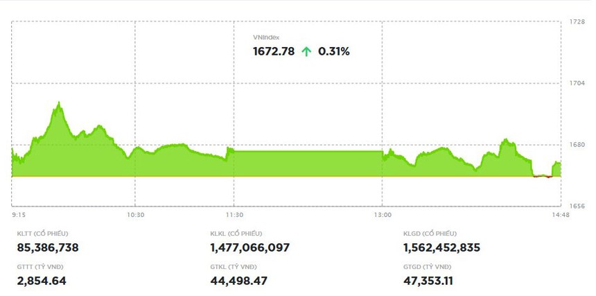 Chốt phiên, VN-Index tăng 5,15 điểm (+0,31%) lên 1.672,78 điểm với 169 mã tăng và 149 mã giảm. Tổng khối lượng giao dịch đạt 1,56 tỷ đơn vị, giá trị 47.353 tỷ đồng, tăng 8,6% về khối lượng và 20% về giá trị so với phiên sáng qua. Trong đó, giao dịch thỏa thuận đóng góp 85 triệu đơn vị, giá trị 2.854,6 tỷ đồng.