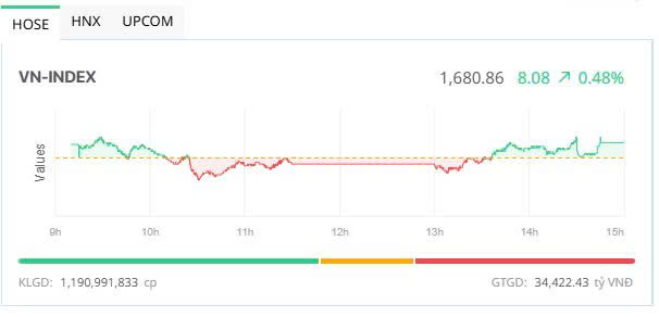 Chốt phiên, VN-Index tăng 8,08 điểm (+0,48%) lên 1.680,86 điểm với 177 mã tăng và 137 mã giảm. Tổng khối lượng giao dịch đạt 1,19 tỷ đơn vị, giá trị 34.422,4 tỷ đồng, giảm 23,7% về khối lượng và 27,3% về giá trị so với phiên sáng qua. Trong đó, giao dịch thỏa thuận đóng góp 59,4 triệu đơn vị, giá trị xấp xỉ 1.700 tỷ đồng.