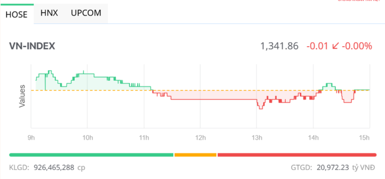 Đóng cửa, sàn HOSE có 163 mã tăng và 162 mã giảm, VN-Index gần như không đổi tại 1.341,86 điểm. Tổng khối lượng giao dịch đạt hơn 926,4 triệu đơn vị, giá trị 20.972,2 tỷ đồng, giảm nhẹ 4% về khối lượng và 6% về giá trị so với phiên hôm qua. Giao dịch thỏa thuận đóng góp hơn 48 triệu đơn vị, giá trị 1.255,5 tỷ đồng.