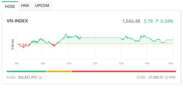 Đóng cửa, sàn HOSE có 86 mã tăng và 233 mã giảm, VN-Index tăng 5,78 điểm (+0,35%) lên 1.666,48 điểm. Tổng khối lượng giao dịch đạt hơn 932,8 triệu đơn vị, giá trị 27.065 tỷ đồng, đạt xấp xỉ so với phiên cuối tuần trước ngày 26/9. Giao dịch thỏa thuận đóng góp gần 124,3 triệu đơn vị, giá trị 3.685,1 tỷ đồng.