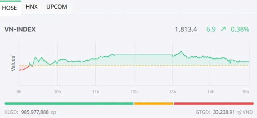 Chốt phiên, sàn HOSE có 191 mã tăng và 127 mã giảm, VN-Index tăng 6,90 điểm (+0,38%), lên 1.813,4 điểm. Tổng khối lượng giao dịch đạt hơn 982,8 triệu đơn vị, giá trị 33.012,7 tỷ đồng, tương đương so với phiên hôm qua. Giao dịch thỏa thuận đóng góp hơn 69,3 triệu đơn vị, giá trị 2.468 tỷ đồng.