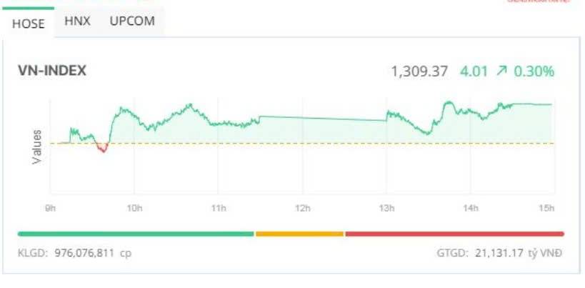 Đóng cửa, sàn HOSE có 240 mã tăng và 223 mã giảm, VN-Index tăng 4,01 điểm (+0,31%) lên 1.309,37 điểm. Tổng khối lượng giao dịch đạt hơn 976 triệu đơn vị, giá trị hơn 21.131 tỷ đồng, tăng 19,75% về khối lượng và 13,23% về giá trị so với phiên cuối tuần qua ngày 28/2. Giao dịch thỏa thuận đóng góp 174,2 triệu đơn vị, giá trị 4.087,6 tỷ đồng.
