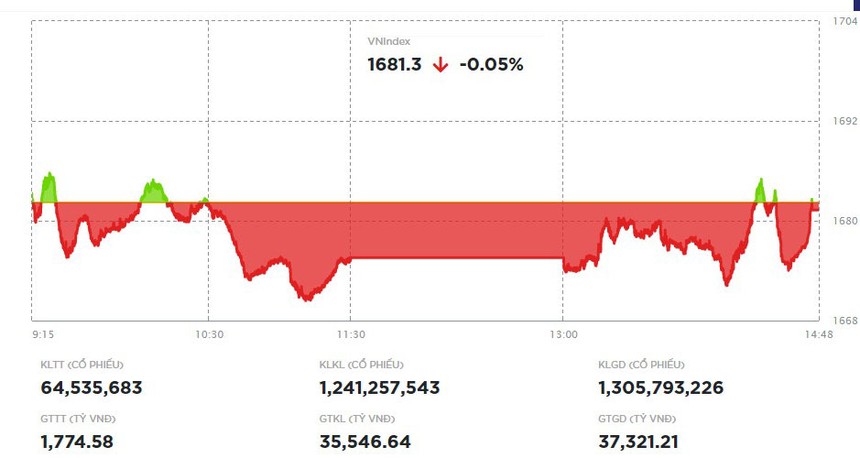 Bước vào phiên giao dịch chiều, diễn biến tương tự như phiên sáng khi VN-Index giằng co trong biên độ hẹp sát tham chiếu và đóng cửa giảm dưới 1 điểm, dù trên bảng điện tử số mã tăng nhiều gấp hơn 2 lần số mã giảm.