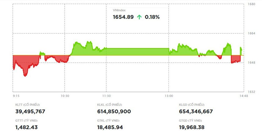 Chốt phiên hôm nay, VN-Index tăng 2,91 điểm (+0,18%) lên 1.654,89 điểm với 121 mã tăng, trong khi có 190 mã giảm. Tổng khối lượng giao dịch đạt 654,3 triệu đơn vị, giá trị 19.968,4 tỷ đồng, giảm 45,4% về khối lượng và 41,7% về giá trị so với phiên hôm qua. Trong đó, giao dịch thỏa thuận đóng góp 39,5 triệu đơn vị, giá trị 1.482,4 tỷ đồng.