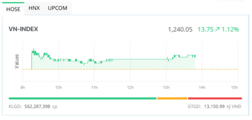 Chốt phiên, sàn HOSE có 220 mã tăng và 80 mã giảm, VN-Index tăng 13,75 điểm (+1,12%) lên 1.240,05 điểm. Tổng khối lượng giao dịch đạt hơn 605,7 triệu đơn vị, giá trị 14.351,8 tỷ đồng, giảm 10,4% về khối lượng và 7,6% về giá trị so với phiên 29/4. Giao dịch thỏa thuận đóng góp gần 28,6 triệu đơn vị, giá trị 846,2 tỷ đồng.
