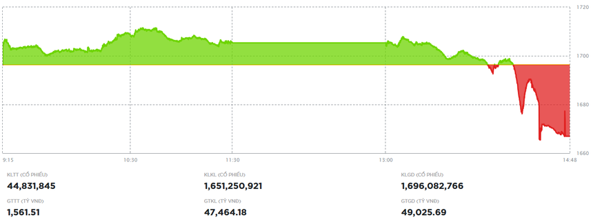 Đóng cửa, sàn HOSE có 100 mã tăng và 230 mã giảm, VN-Index giảm 29,32 điểm (-1,73%), xuống 1.666,97 điểm. Tổng khối lượng giao dịch đạt hơn 1,69 tỷ đơn vị, giá trị 48.820 tỷ đồng, tăng 22% về khối lượng và 23% về giá trị so với phiên hôm qua. Giao dịch thỏa thuận đóng góp hơn 62 triệu đơn vị, giá trị 1.362 tỷ đồng.