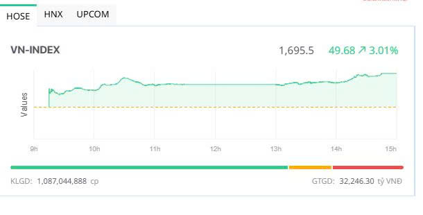 Đóng cửa, sàn HOSE có 259 mã tăng và 68 mã giảm, VN-Index tăng 49,68 điểm (+3,02%) lên 1.695,5 điểm. Tổng khối lượng giao dịch đạt 1,08 tỷ đơn vị, giá trị 31.784 tỷ đồng, tăng 25,6% về khối lượng và 29,4% về giá trị so với phiên cuối tuần qua ngày 3/10. Giao dịch thỏa thuận đóng góp hơn 82,2 triệu đơn vị, giá trị 2.730,2 tỷ đồng.
