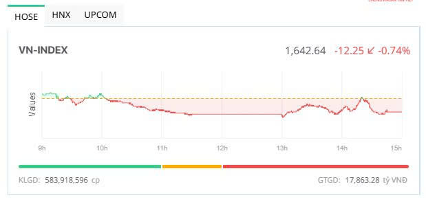 Chốt phiên, VN-Index giảm 12,25 điểm (-0,74%) xuống 1.642,64 điểm với 131 mã tăng và 176 mã giảm. Tổng khối lượng giao dịch đạt 583,9 triệu đơn vị, giá trị 17.863 tỷ đồng, cùng giảm hơn 10,5% cả về khối lượng và giá trị so với phiên hôm qua. Trong đó, giao dịch thỏa thuận đóng góp 33,8 triệu đơn vị, giá trị 954,8 tỷ đồng.