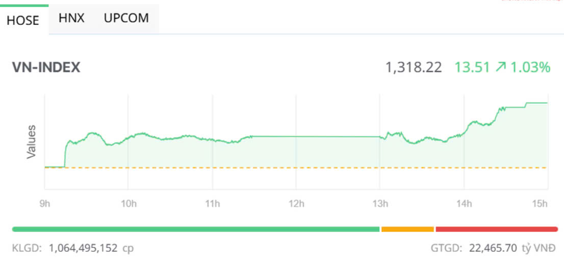 Đóng cửa, sàn HOSE có 365 mã tăng và 121 mã giảm, VN-Index tăng 13,51 điểm (+1,04%), lên 1.318,22 điểm. Tổng khối lượng giao dịch đạt hơn 1.064,4 triệu đơn vị, giá trị 22.465,7 tỷ đồng, tăng gần 9% về khối lượng và gần như tương đương về giá trị so với phiên hôm qua. Giao dịch thỏa thuận đóng góp hơn 80,5 triệu đơn vị, giá trị 1.824,3 tỷ đồng.
