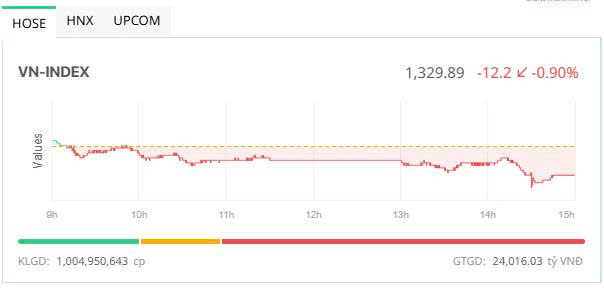 Chốt phiên, sàn HOSE có tới 233 mã giảm, gấp gấp hơn 3 lần số mã tăng (76 mã), VN-Index giảm 12,2 điểm (-0,91%), xuống 1.329,89 điểm. Tổng khối lượng giao dịch đạt 1.005 triệu đơn vị, giá trị 24.016 tỷ đồng, tăng 22,7% về khối lượng và 25,3% về giá trị so với phiên hôm qua. Giao dịch thỏa thuận đóng góp hơn 68,3 triệu đơn vị, giá trị gần 1.750 tỷ đồng.