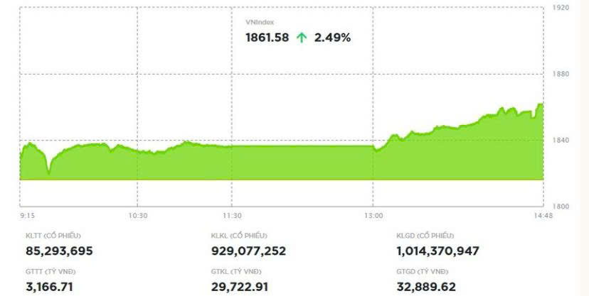 Chốt phiên, VN-Index tăng 45,31 điểm (+2,49%) lên 1.861,58 điểm với 256 mã tăng, gấp hơn 3 lần so với 79 mã giảm. Tổng khối lượng giao dịch đạt hơn 1 tỷ đơn vị, giá trị 32.889 tỷ đồng, tăng hơn 6% về khối lượng và 19,8% về giá trị so với phiên hôm qua. Trong đó, giao dịch thỏa thuận đóng góp 85,8 triệu đơn vị, giá trị 3.177,5 tỷ đồng.