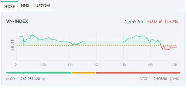 Chốt phiên, VN-Index giảm 6,02 điểm (-0,32%) xuống 1.855,56 điểm với 144 mã tăng và 183 mã giảm. Tổng khối lượng giao dịch đạt hơn 1,26 tỷ đơn vị, giá trị 40.106 tỷ đồng, tăng 26% về khối lượng và 21,9% về giá trị so với phiên hôm qua. Trong đó, giao dịch thỏa thuận đóng góp xấp xỉ 90 triệu đơn vị, giá trị 3.997,4 tỷ đồng.