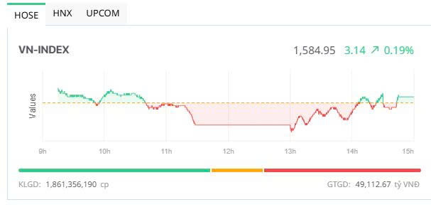 Đóng cửa, sàn HOSE có 177 mã tăng và 155 mã giảm, VN-Index tăng 3,14 điểm (+0,2%), lên 1.584,95 điểm. Tổng khối lượng giao dịch đạt 1,86 tỷ đơn vị, giá trị 49.112,7 tỷ đồng, tăng 9,4% về khối lượng và 11,2% về giá trị so với phiên hôm qua. Giao dịch thỏa thuận đóng góp gần 34,5 triệu đơn vị, giá trị hơn 941 tỷ đồng.