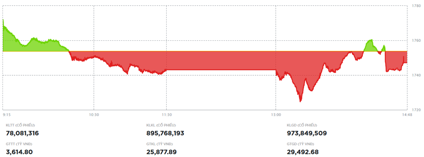 Đóng cửa, sàn HOSE có 93 mã tăng và 234 mã giảm, VN-Index giảm 6,57 điểm (-0,37%), xuống 1.747,17 điểm. Tổng khối lượng giao dịch đạt hơn 973,8 triệu đơn vị, giá trị 29.492,7 tỷ đồng, tăng hơn 31% về khối lượng và 37% về giá trị so với phiên hôm qua. Giao dịch thỏa thuận đóng góp hơn 78 triệu đơn vị, giá trị 3.626 tỷ đồng.