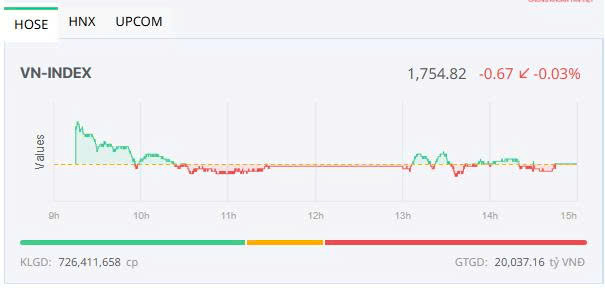 Đóng cửa, sàn HOSE có 151 mã tăng và 175 mã giảm, VN-Index giảm 0,67 điểm (-0,04%), xuống 1.754,82 điểm. Tổng khối lượng giao dịch đạt hơn 726,4 triệu đơn vị, giá trị 20.037 tỷ đồng, giảm 35,75% về khối lượng và 43% về giá trị so với phiên cuối tuần trước ngày 6/2. Giao dịch thỏa thuận đóng góp hơn 208,8 triệu đơn vị, giá trị 4.891,3 tỷ đồng.