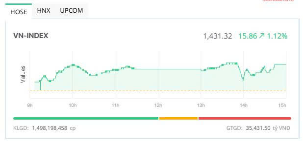 Chốt phiên, sàn HOSE có 192 mã tăng và 127 mã giảm, VN-Index tăng 15,86 điểm (+1,12%), lên 1.431,32 điểm. Tổng khối lượng giao dịch đạt gần 1,5 tỷ đơn vị, giá trị 35.431,5 tỷ đồng, tăng 22,95% về khối lượng và 25,23% về giá trị so với phiên hôm qua. Giao dịch thỏa thuận đóng góp 25,8 triệu đơn vị, giá trị 958,6 tỷ đồng.