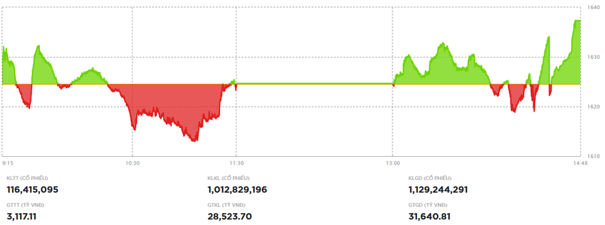 Đóng cửa, sàn HOSE có 168 mã tăng và 130 mã giảm, VN-Index tăng 12,79 điểm (+0,79%), lên 1.637,32 điểm. Tổng khối lượng giao dịch đạt hơn 1,12 tỷ đơn vị, giá trị 31.288,9 tỷ đồng, giảm hơn 41% cả về khối lượng và giá trị so với phiên hôm qua. Giao dịch thỏa thuận đóng góp hơn 117 triệu đơn vị, giá trị 3.126 tỷ đồng.