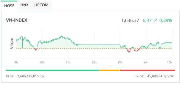 Chốt phiên, sàn HOSE có 199 mã tăng và 130 mã giảm, VN-Index tăng 6,37 điểm (+0,39%) lên 1.636,37 điểm. Tổng khối lượng giao dịch đạt hơn 1,6 tỷ đơn vị, giá trị gần 45.090 tỷ đồng, giảm 22,2% về khối lượng và 24,2% về giá trị so với phiên cuối tuần trước ngày 15/8. Giao dịch thỏa thuận đóng góp gần 95,5 triệu đơn vị, giá trị 2.347,9 tỷ đồng.