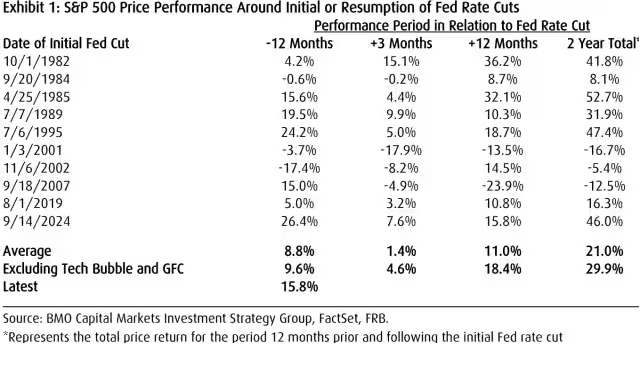 Kể từ năm 1982, S&P 500 đã mang lại lợi nhuận dương trong 12 tháng sau những đợt cắt giảm lãi suất đầu tiên trong 8 trên 10 chu kỳ gần đây, với mức tăng trung bình gần 11%, theo dữ liệu được tổng hợp bởi BMO Capital Markets (xem bảng bên dưới).