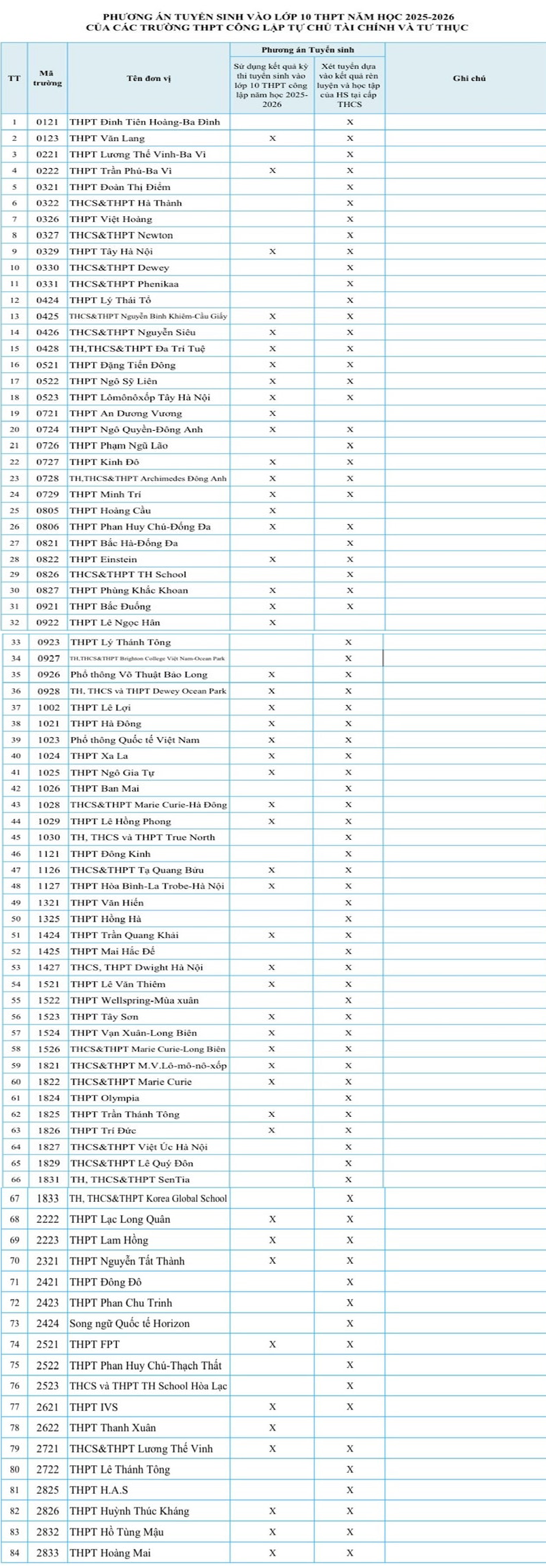Chi tiết phương án tuyển sinh của 84 trường THPT công lập tự chủ tài chính và THPT tư thục tại Hà Nội:
